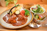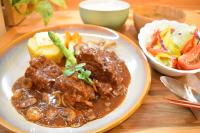 スタッフに大人気のメニュー! 京桜みそを使用したデミグラスソースだけでご飯1杯食べられちゃいますよ! ※付け合わせの野菜は仕入れで変わります。
